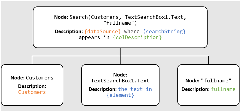 In the example above, we can see that Customers is the name of a table, Full Name is the name of a column in that table, and TextSearchBox1 is the name of a text input control.