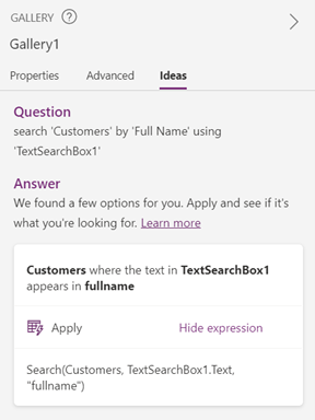 Finally, after the post-processing stage is finished, the resulting Power Fx formulas and natural language descriptions are displayed in the frontend. The user can simply click “Apply” to use the formula and see the results. Going back to the sample use-case we started with, we can see that we have successfully built a search functionality for records in the gallery. With the help of Power Apps Ideas, writing Power Fx formulas has never been easier!