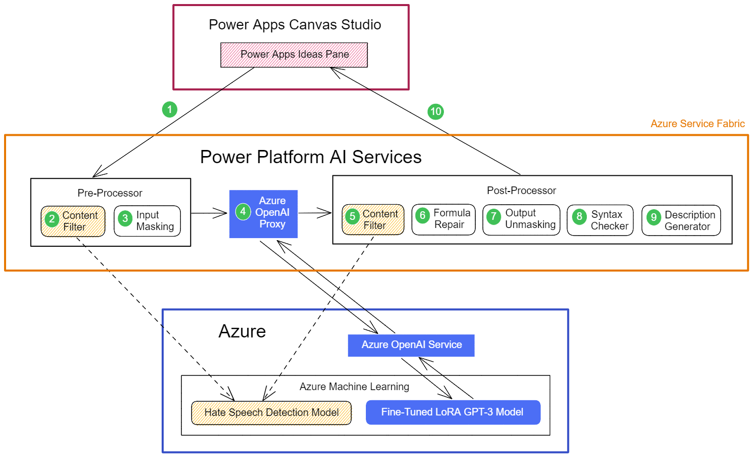 In addition, there are several other key components involved in the process. These core pieces are part of the Power Platform AI Services (hosted in Azure Service Fabric), which provides a shared infrastructure for Power Platform products that want to leverage AI capabilities like GPT-3.