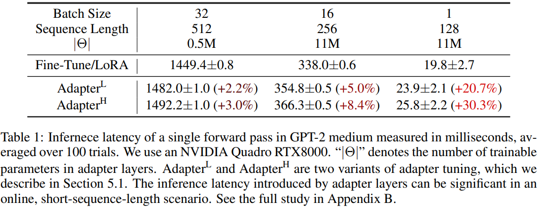 As we can see in the table above, for small batch sizes, the inference latency introduced by adapter layer designs can be quite significant compared to LoRA.