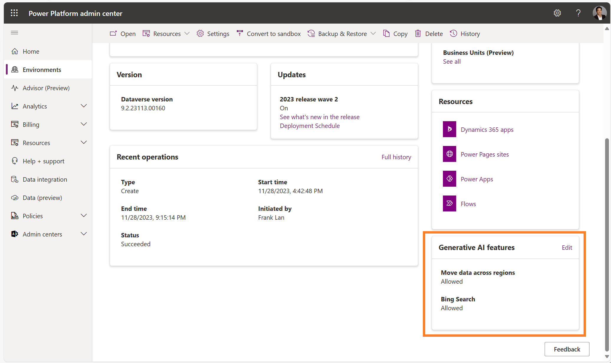 This can be found under Environments > [Your Environment] > Generative AI features