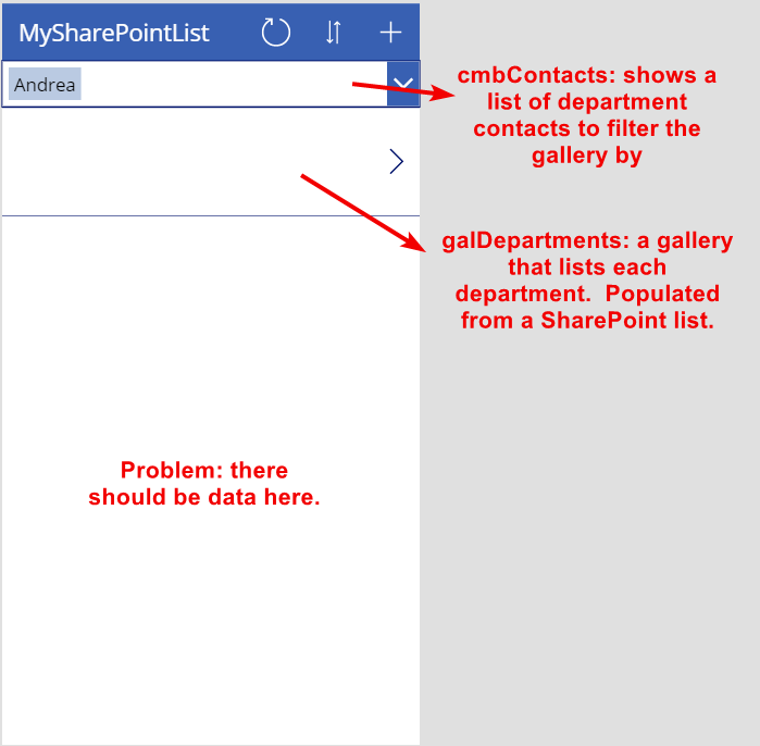This should be an easy test. In our example, we can simply set the gallery’s Items property to MySharePointList (no filter). If the unfiltered datasource populates some items in the gallery, then we know that there are rows present.