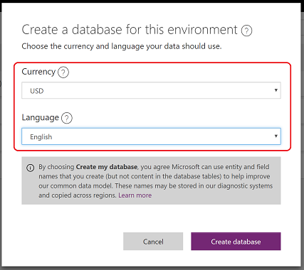 5. Once the environment is created, proceed for creating a Database. Select the currency and language for the data stored in the database and click on Create database.