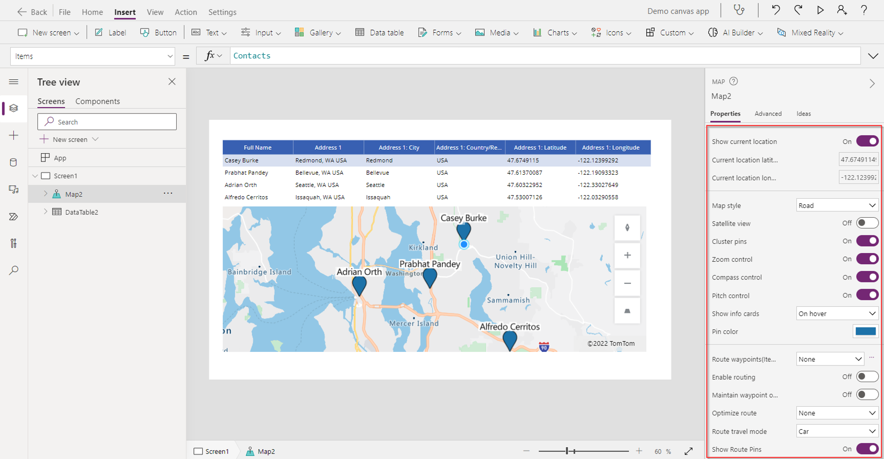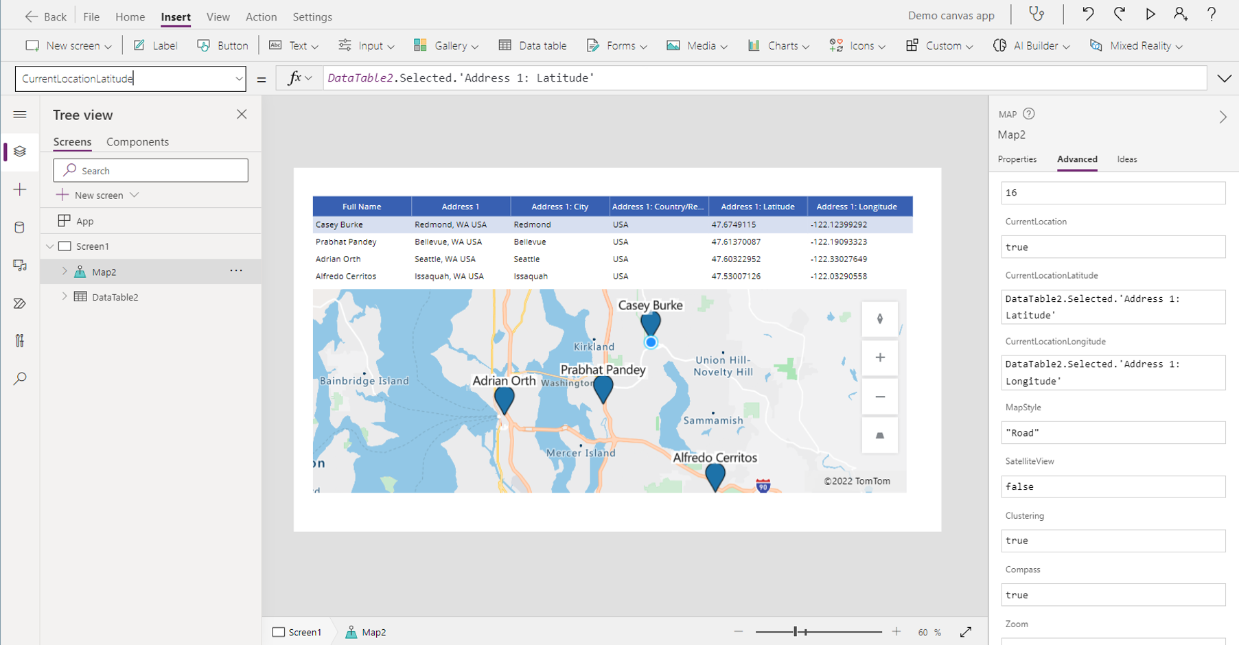 3. Add the map control. See Use an interactive map control in Power Apps