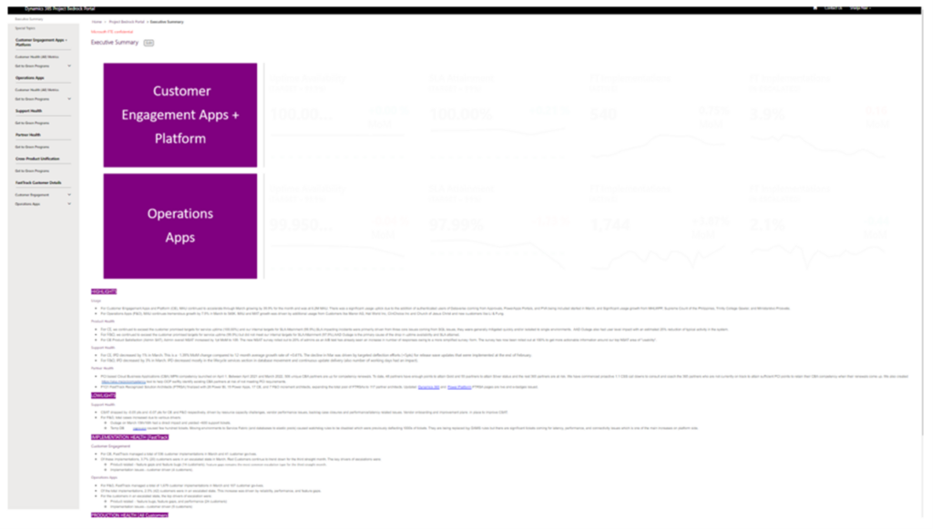Every organization, large or small, has the need to keep a pulse on its service health. Microsoft’s Digital Transformation Platform (DTP) Group uses Dynamics 365, Power Apps Portals and Power BI to track and review key metrics for all products across the organization as part of their monthly business reviews.
