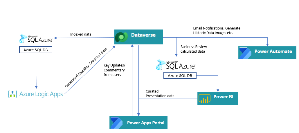 - Most of the key data used during the reviews is hosted in Dataverse and Azure SQL DB. At the beginning of each month, a snapshot of data is taken using Logic Apps. This data is then pushed back into Dataverse, from where curated data is made available to be consumed in the Portal.