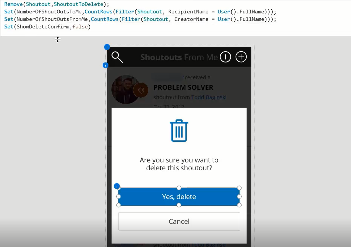 Discover how you can create a pop-up dialog in PowerApps with the Shoutouts sample app. The Shoutouts app encourages coworkers to share job-related compliments and sends automatic email notifications to recipients’ managers. |
