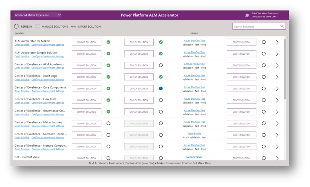 The ALM Accelerator for Power Platform includes a canvas app that sits on top of Azure DevOps Pipelines and Git source control. The app provides a simplified interface for makers to regularly export the components in their Power Platform Solutions to source control and create deployment requests to have their work reviewed before deploying to target environments.