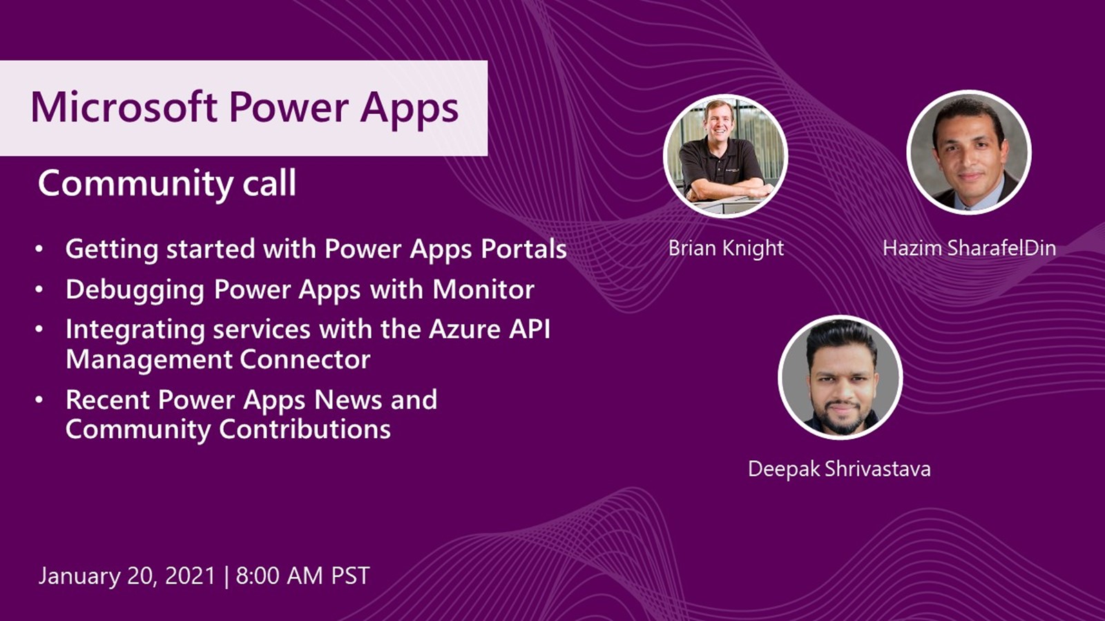 The Power Apps community call brings in the new year with an amazing set of topics! Power Apps MVP, Brian Knight, will show how to get started with Power Apps Portals creating anonymous access solutions with the Power Platform. The second topic is by MVP and Demo Extravaganza all-star Deepak Shrivastava demystifying how to use Azure API management with the Power Platform and finally the much requested topic monitoring and simplifying Power Apps debugging by Microsoft’s own Hazim SharafelDin with his feature: Monitor in Power Apps