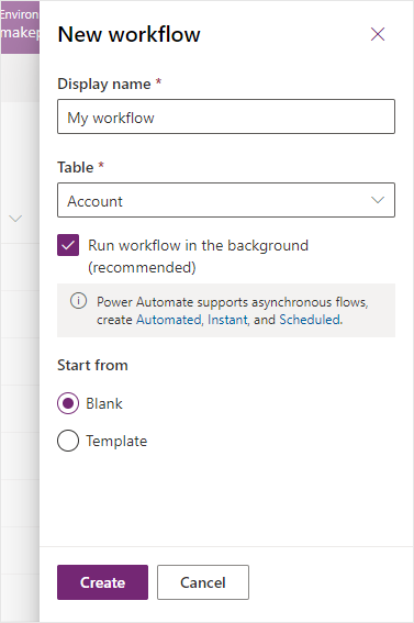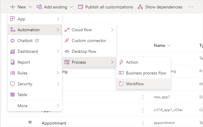 Until now classic Workflows and Actions, as well as Business process flows, were not available to add to a solution without switching to classic or navigating to the Power Automate portal. All three types now have a quick create experience in the solution explorer.