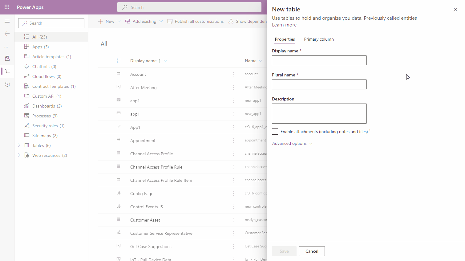 The number of different objects you can add to a solution is growing rapidly, so a flat list of objects to create or add to your solution was getting too long. A new experience for these menus is part of this enhancement, with a top-level menu that has the most used object types, expanding to object types that are used somewhat less frequently – and all other object types are alphabetized in a final overflow menu. Based on usage, we may promote or demote object types during the preview to make sure the most used are quickly accessible.