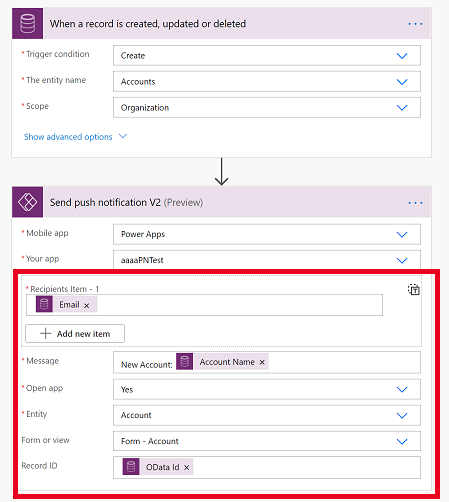 In this screenshot, we are creating a push notification to the user whose email is on the created Account record with a message including the new account’s name. The push notification, when tapped on, will open the account record on the Form – Account form.