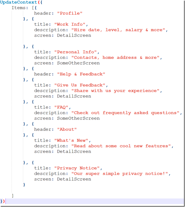 One obvious approach to achieve the above UI is to layout all of the controls (a total of 27 including right arrows, rectangles, separators and labels).  Instead one construct a collection and bind it to a gallery as follow.