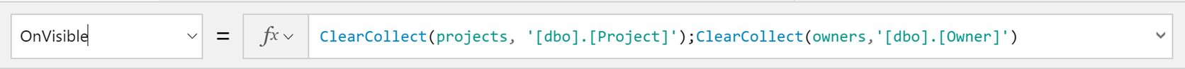 In this example, we will first collect the tables into local collections. We will bind the gallery Items property to the local collection and use the owner collection for LookUps. On the OnVisible event, we add the following statements: