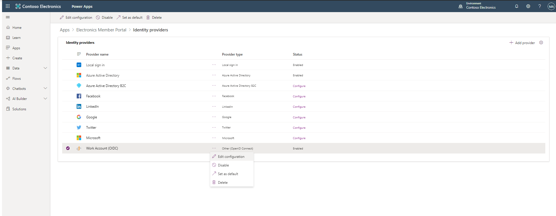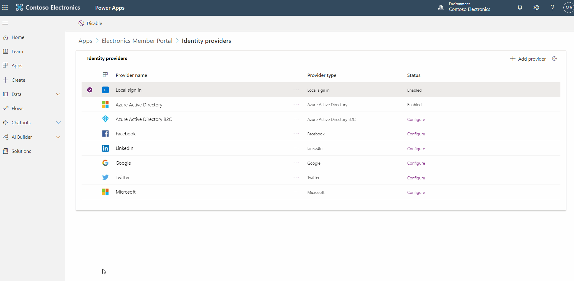 - Actions such as enable / disable providers, setting a default provider (including Local Sign-in and Azure Active Directory).