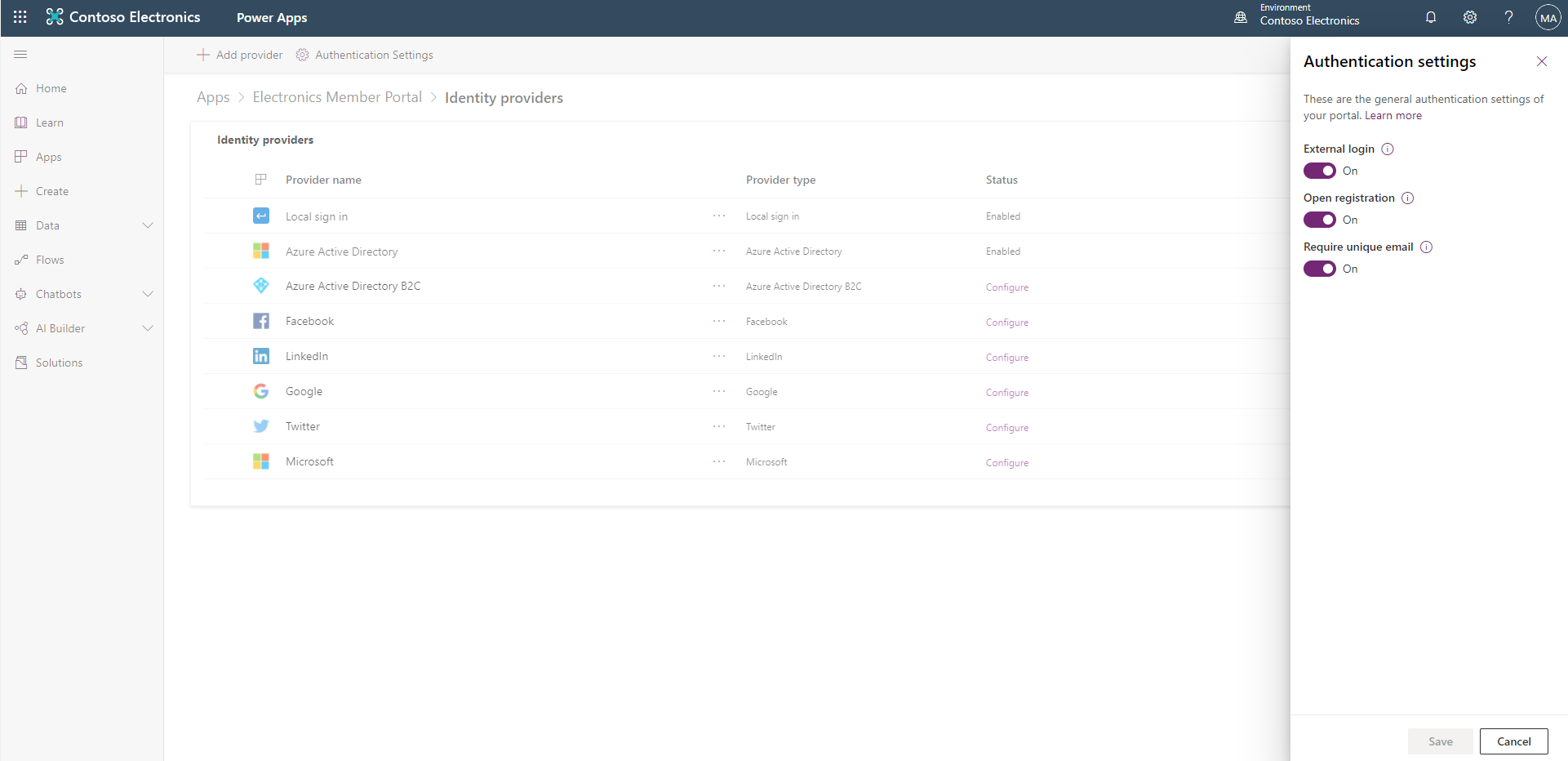 With this feature we are introducing a simplified experience to create and manage authentication settings and identity provider configuration. The experience aims to provide better discovery of supported providers, in-app guidance for makers / administrators to do this quickly and reduce common configuration errors. We have also refreshed portals authentication documentation to support this new experience.