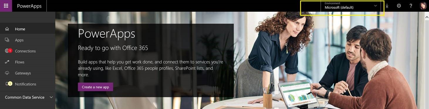 We added the Environment label to our environment dropdown. This new label can be found in the top right hand corner of the PowerApps header as can be seen below.