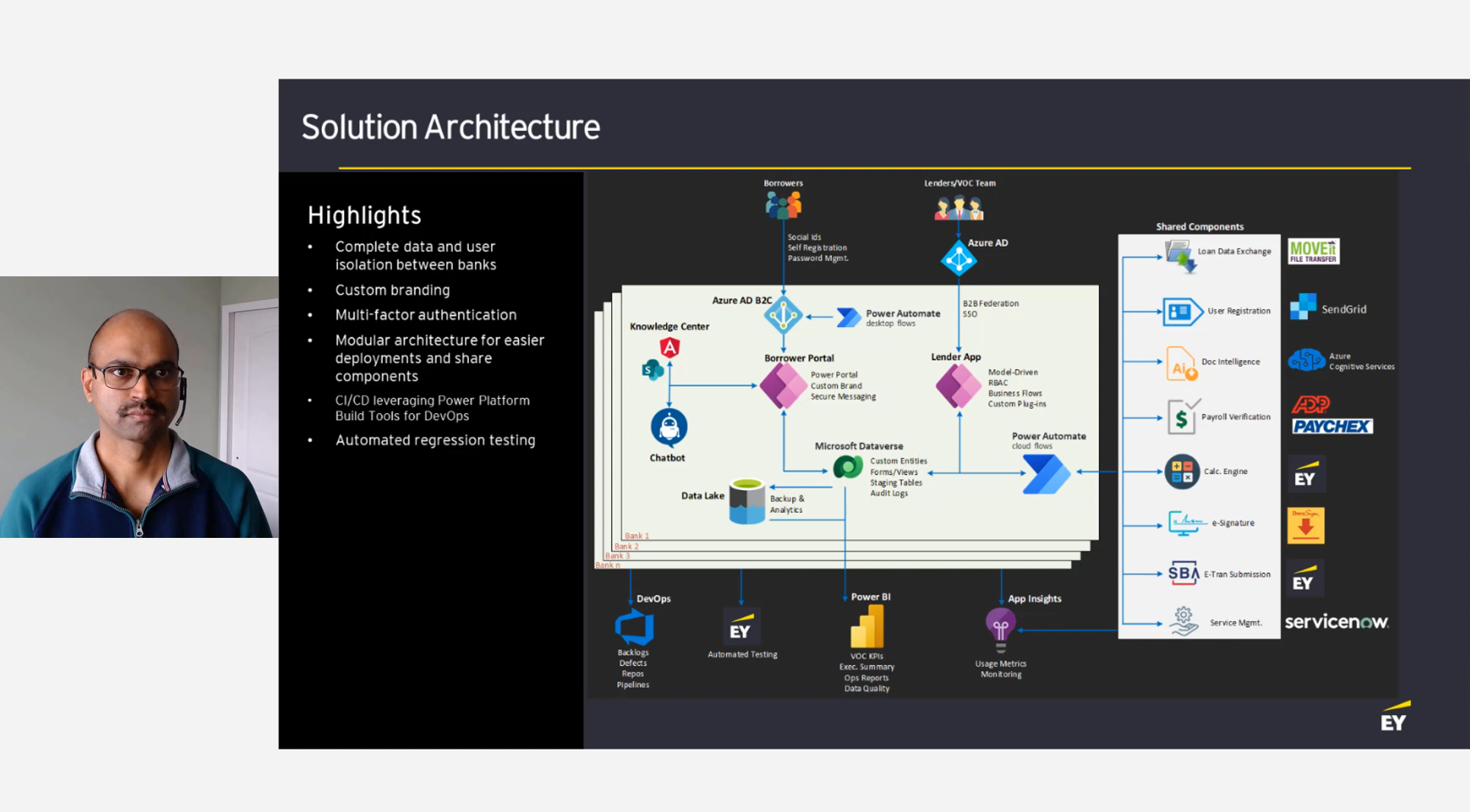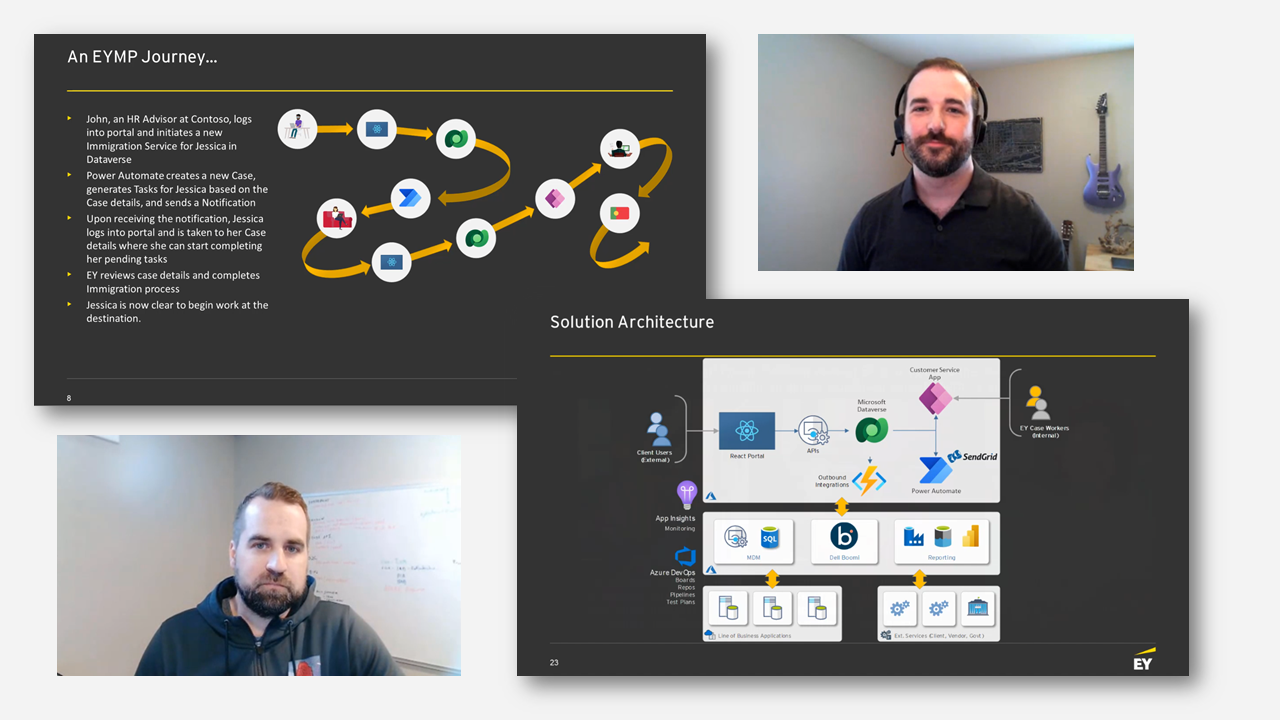 Two professional development teams at EY share how they have embraced the best of low code and code-first solutions to digitize and automate some very complex business requirements. The solutions utilize a wide breadth of Microsoft Power Platform capabilities – centralized storage of all data in Dataverse, modular components built using Power Apps, Power Automate and Power Virtual Agents, dashboards built with Power BI, integration with internal EY systems, Azure services and several 3rd party services, connectivity from a custom React portal to Dataverse via the SDK, robust ALM processes using Azure DevOps, and more.