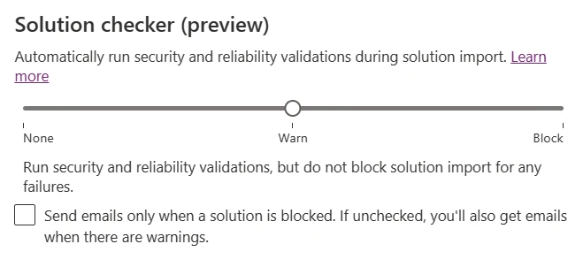 In Warn mode, solutions can be imported even if they weren’t checked with solution checker or if they contain critical violations.