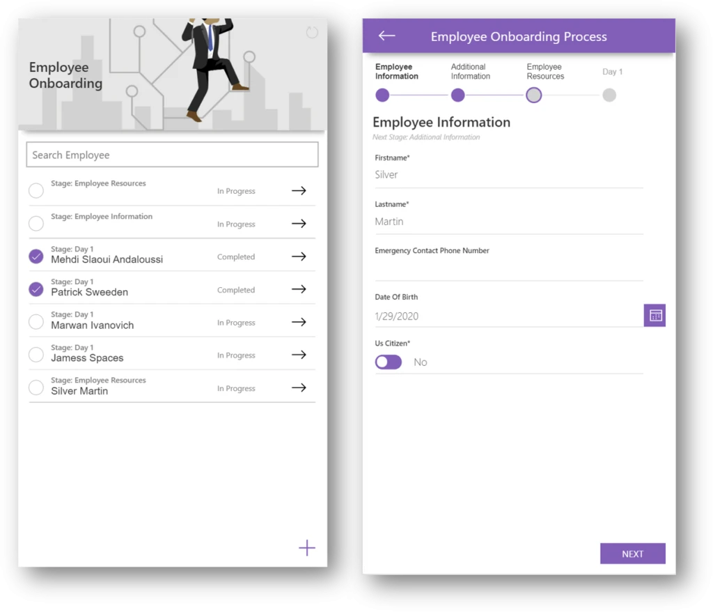 For our on-boarding example, a possible look and feel for a canvas app could look like the following: