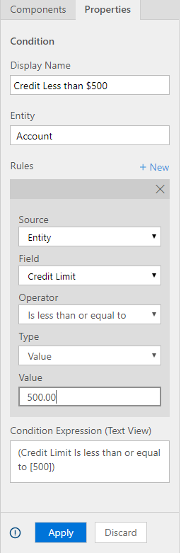 - Click the New condition box on the top right, this will open the properties panel on the right