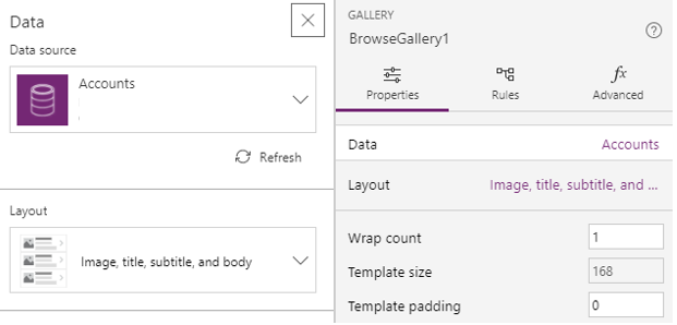 - In the Data area of the property panel on the right, click Accounts