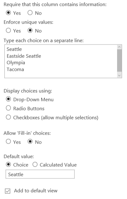 HEADS UP: We currently have a connector issue logged where the SharePoint default field value for choice lists is only recognized by PowerApps if it is the very first option in the list of choices on SharePoint. Because of this, if you want to use a default value for that SharePoint choice field within your PowerApp; make sure it’s at the top of the choice list. You can see this setting in the screen shot below. (in that case, we set this default because 99% of the end users will be lodging in the “Seattle” area). In addition to this note, I will sometimes enter “Select One” at the top of the choice list whenever I want my PowerApp to default to a blank value….then I’ll set a pre-submission data validation (like the OnChange one in this article) to trap that “Select One” value if left unchanged, and if I don’t want blanks in my data. (We hope to have this SP connector issue resolved very soon, but I wanted to be transparent on it so you’d know -smiles.)