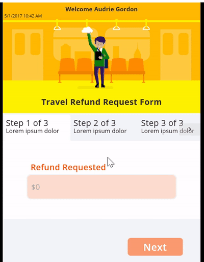 3. EVALUATE ERRORS ON CHANGE – In the animation above I also demonstrate the user experience for evaluation of errors on change (or on focus loss as some form designers refer to this). It is displayed based on a variable, plus a condition set in the ‘Visible’ property of the label containing the error text. However, it is not evaluated until the end user leaves the text input control. Let’s start with the variable first; I dynamically create a variable called VarRefund whenever the value changes in that control. I did this by setting an OnChange condition directly on the Text Input Control: