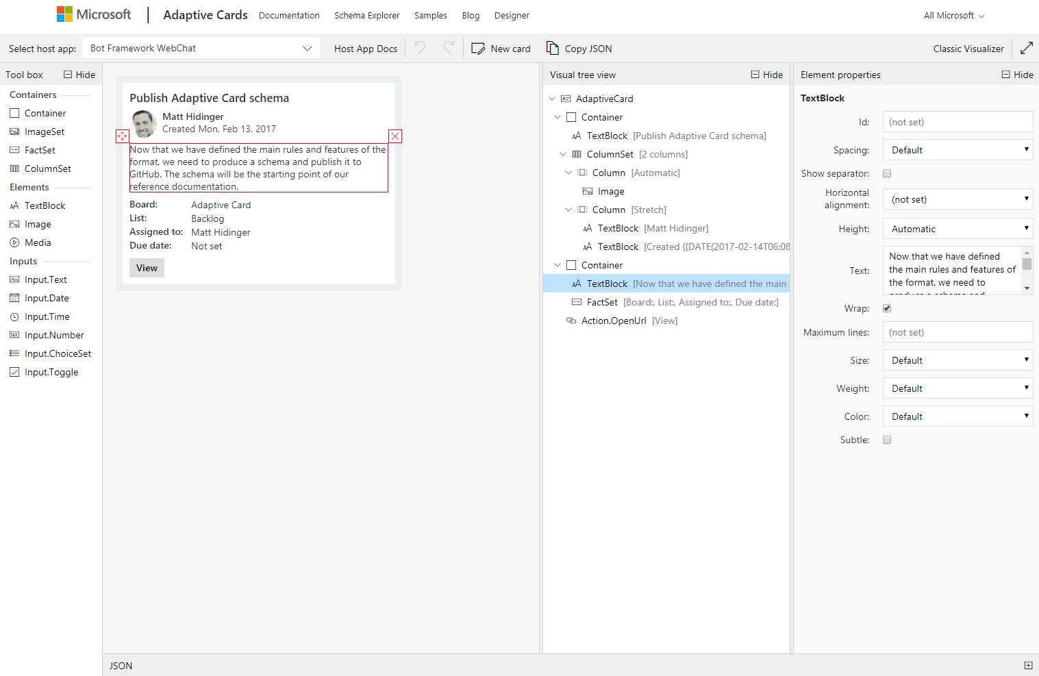 Adaptive cards use a common JSON format that you can use across many different channels. However, you don’t need to author this JSON by hand – you can use the rich drag-and-drop designer on the Adaptive Cards website to build your card.