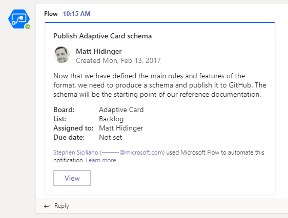 Once you have added all of the elements that you want on the card, open the JSON pane at the bottom and copy everything there. Then, paste that entire content in the Message field on the action in the Flow designer. When the action runs, a nicely formatted adaptive card will appear in the Teams channel you selected: