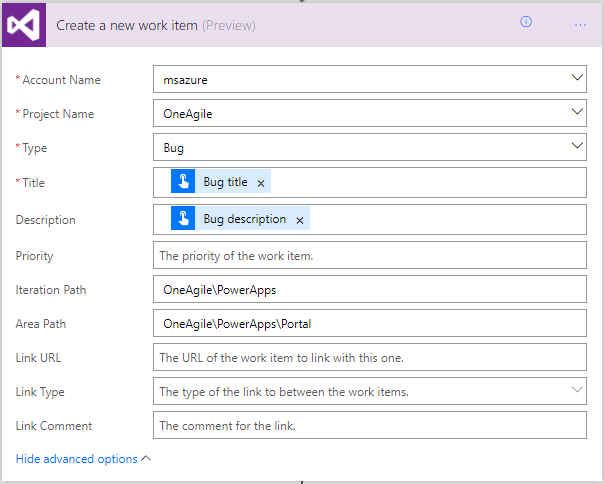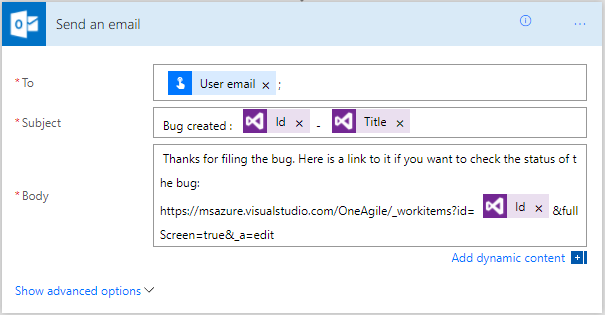 Next, let’s add an action to file a bug in Visual Studio Team Services