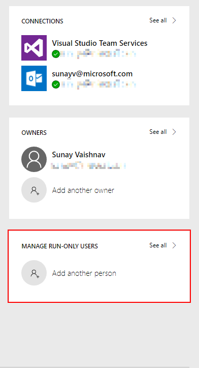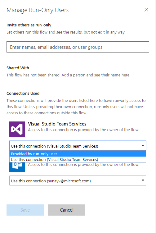In the Connections used section, click on the dropdown under Visual Studio Team Services and configure it to be “Provided by run-only user”