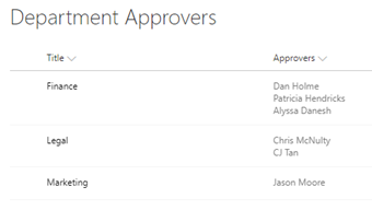 You also have a SharePoint list (‘Department Approvers’) that has the approvers for each department. Notice how Approvers is a multi-value people field where Finance has 3 approvers, Legal has 2 approvers, and Marketing has a single approver.