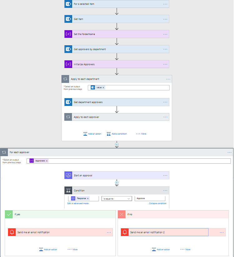 Since the Get approvers by department action returns an array of values (albeit of size 1), you’ll need to add an apply to each loop and iterate over the array. For each item, first Get the item properties (Get department approvers). Then, create another apply to each loop to iterate over Approvers (recall that Approvers is a multi-value people field) and append it to the Approvers variable (using the Append to array variable action).