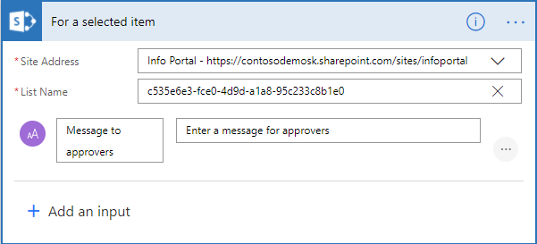 To allow your end-users to start the workflow manually whenever they want to seek approval on a given document and provide runtime inputs like a Message to approvers, use the For a selected item trigger.