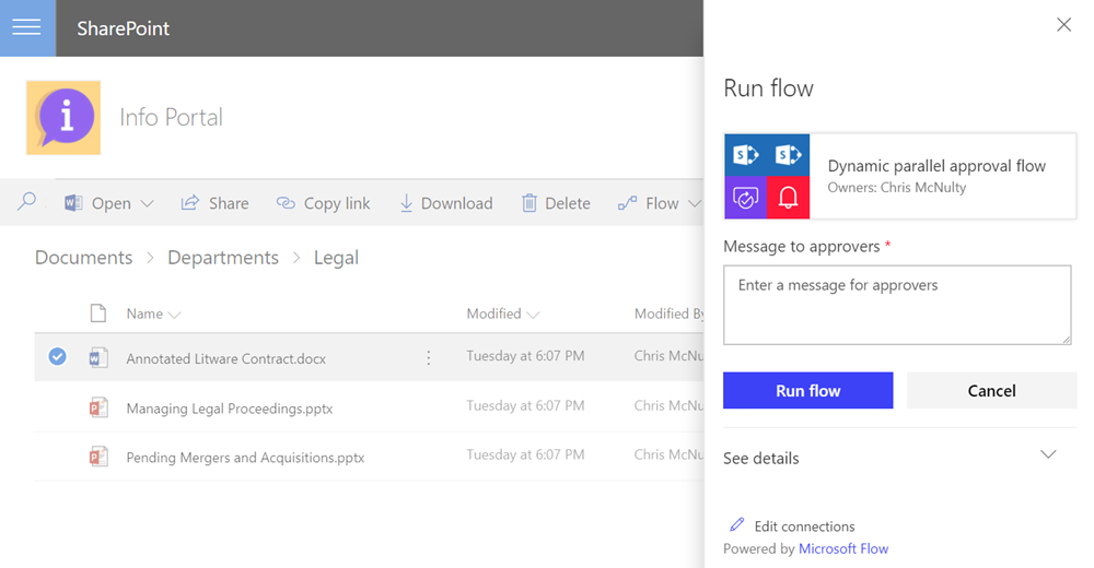 When invoked in SharePoint, end-users can see details about the Flow and enter a message via the Flow launch panel. (Learn more about the Flow launch panel)