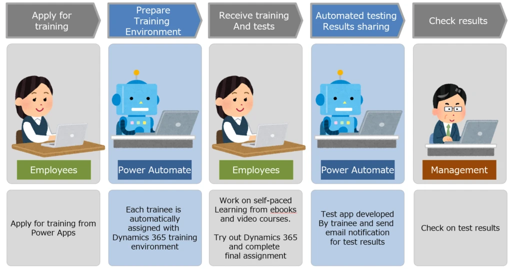 With e-learning portal, employees can remotely access training content and assessments on-demand, and earn certification for model-driven app development with Microsoft Power Platform. Power Automate is used to create training environments and Common Data Service databases automatically once employees have registered for the training. Users can work at their own pace to view the training content, complete all the assignments in the training environment, and take the exams. Power Automate assesses the test results and send result notifications to the trainees through automated emails.