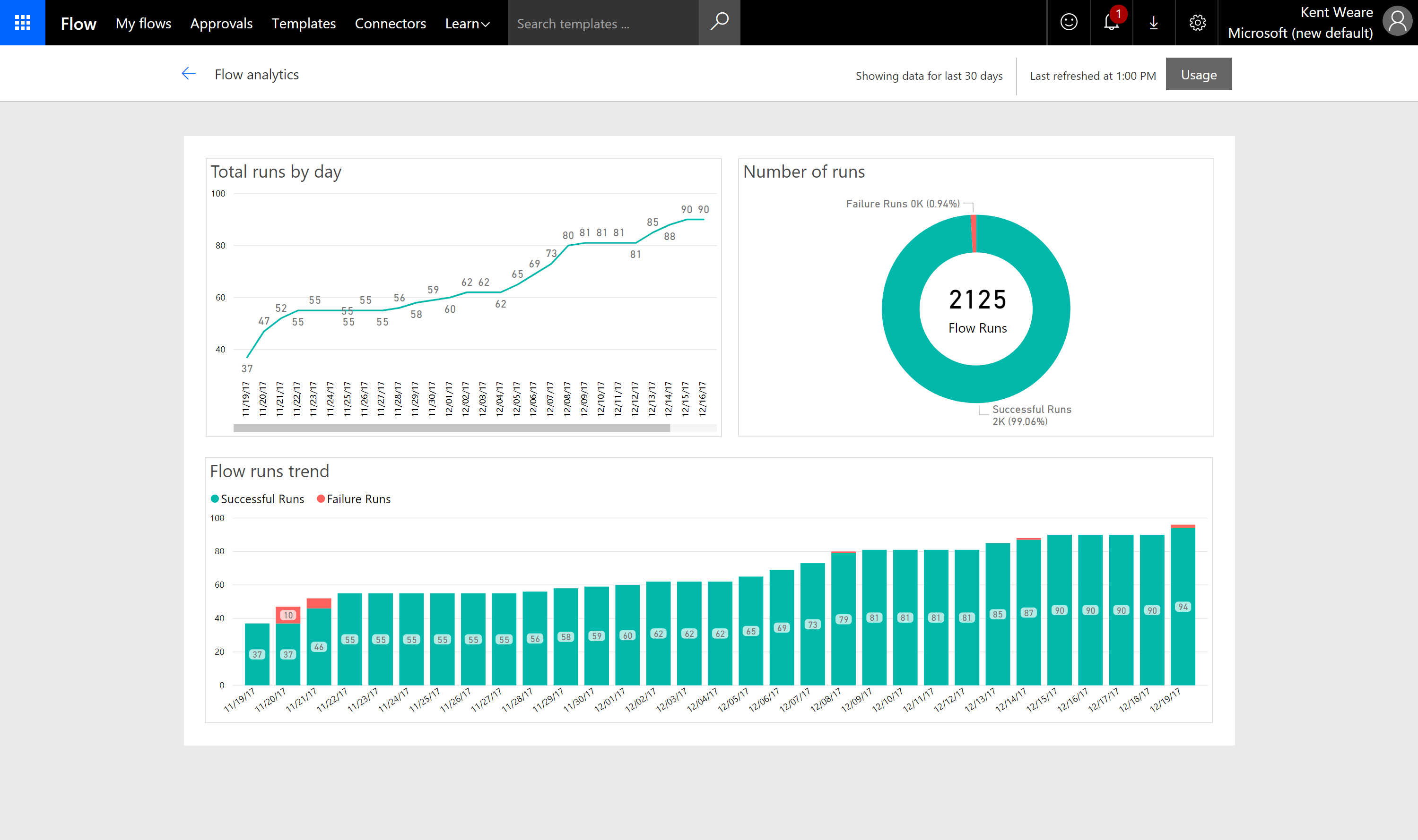 - Using any of these approaches, you will be transitioned to an analytics experience for that specific flow. As you can see in the following image, there are 3 visualizations available for us to explore. The current experience is focused on the number of run executions and whether they are successful or have failed. We provide both metrics over a span of the last thirty days.