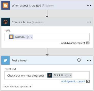 For example, if your blog is hosted on Blogger, you can simply set up a flow so that a new post triggers a new Bitlink to be created and posted on Twitter.