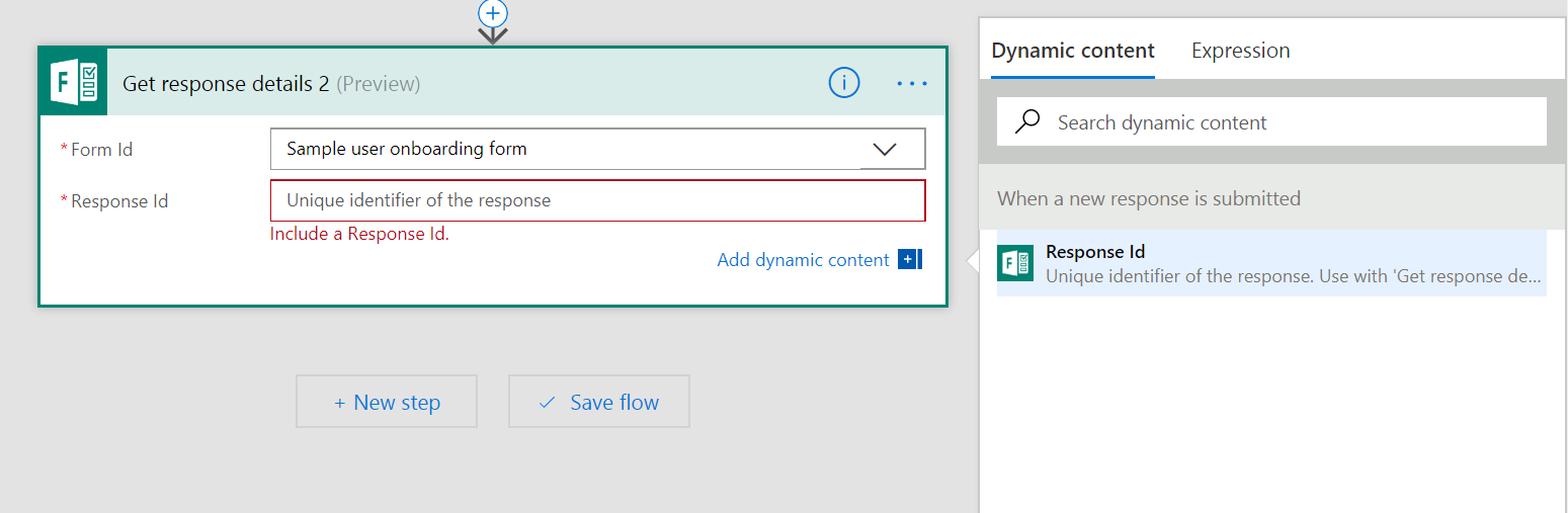 On this action, you’ll need to select the same Form Id that you used in the trigger. Then, click in the Response Id text box, you’ll see the Dynamic content menu pop up: