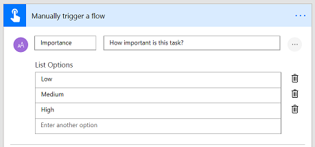 At the same time, we are giving authors more control over the data that they collect with the button. Previously, authors could just define free-form text fields, but now they can have people choose from a pre-defined list of options instead. For example, if a button should have an importance chosen for a task, options can be entered for Low, Medium, and High. Now that the button is guaranteed to have one of these three values, the flow can have logic that depends on one these specific values.