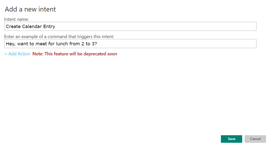 In the dialog that follows, provide the intent  name and an example string. Save your intent.
