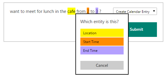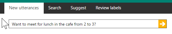 Provide examples of utterances that contain the models you defined in the previous steps. Figure below shows an example of one such utterance. Train your app by marking the models on the example string.