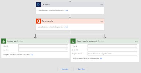 The above template shows how this works. It reads a record from Dynamics 365 and tries to look up that user’s email in the Office 365 directory. If the user is found, then a task is created in planner with that email address. Otherwise, the task can still be created in planner, but it won’t have email information.