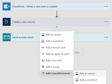 First, you’ll have to figure out which action you want to monitor for failures. If you already have actions after that step, you can add a new step after in parallel. In this example, let’s look at adding an error handling step for the Dynamics 365 action Create a new record: