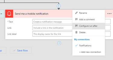 You can then select what action you want. Once you have a new step, select the “…” menu at the top-right of the action and choose the Configure run after menu item: