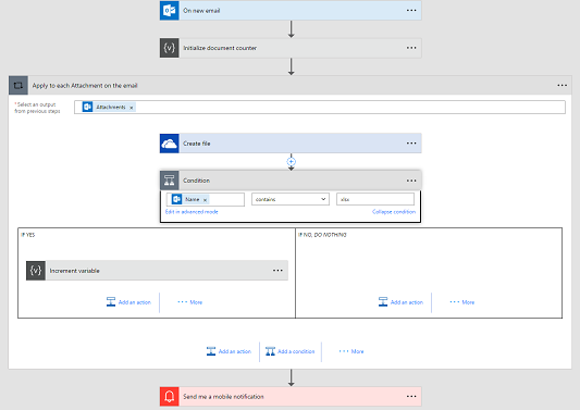 In the above flow you can see at the top the variable is initialized, it’s incremented inside a condition in a apply-to-each loop, and then at the end a notification is sent with the contents of the variable.