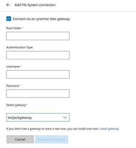 Once the installation is complete and the Data gateway is configured, add a “File System” connection by navigating to the “Gear” icon -> Connections -> Create Connection -> File System and select the “Connect via on-premise data gateway”. You should be able to see your data gateway in the drop down list. Complete the connection creation.