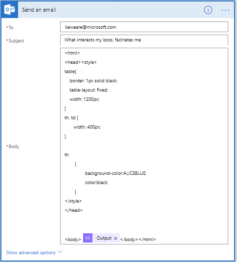 - Lastly, we will use the Send an email action to send our digest our to our interested user. We can also include formatting by embedding CSS selectors.