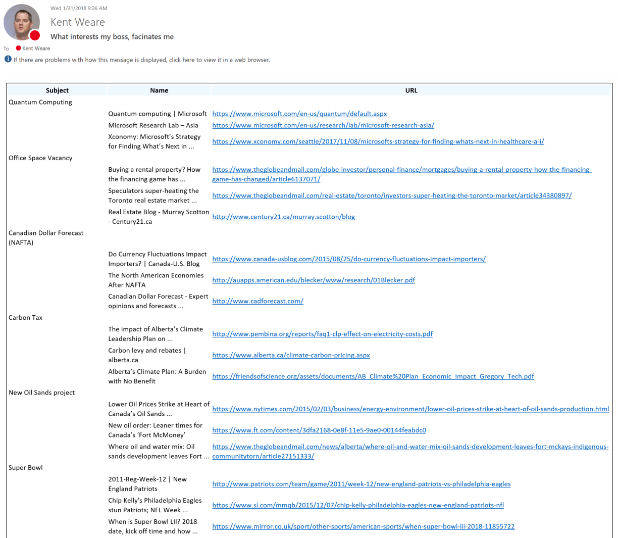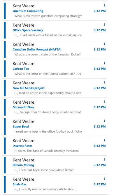 When I was chatting with Mark, he brought up Microsoft’s abilities in cognitive computing and felt there must be a way “to leverage this technology in order help him and customers scale.” One use case he identified was managing communication that he receives from his leader, Sarah Kennedy. There is an old saying, “What interests my boss fascinates me” and that is the inspiration for this blog post.